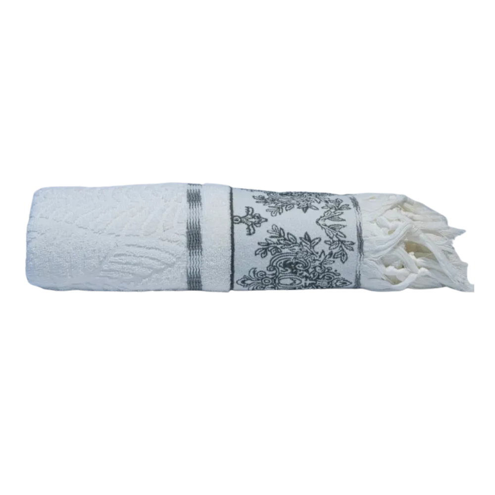 بشكير سراي كبير بحدود زخرفية (11). فاخر وناعم وامتصاصي للغاية. المقاس 90×155 سم. متوفر بالألوان: أبيض، أوف وايت، رمادي فاتح، كشمير فاتح، وردي فاتح، موف داكن، موف فاتح، أخضر نعناعي، بيج، كشمير داكن.