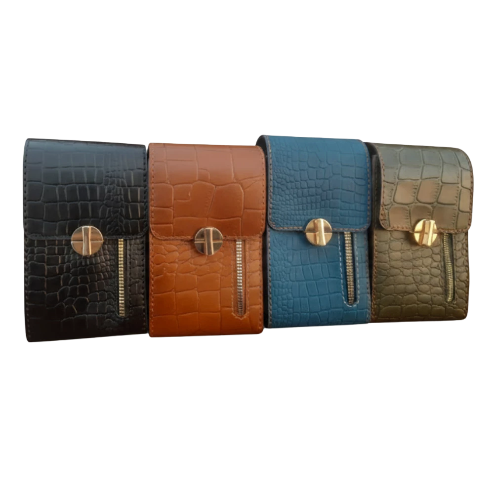 حقيبة جلد طبيعي صغيرة مزخرفة بنقشة جلد التمساح، بتصميم عملي بحجم 12×20 سم.