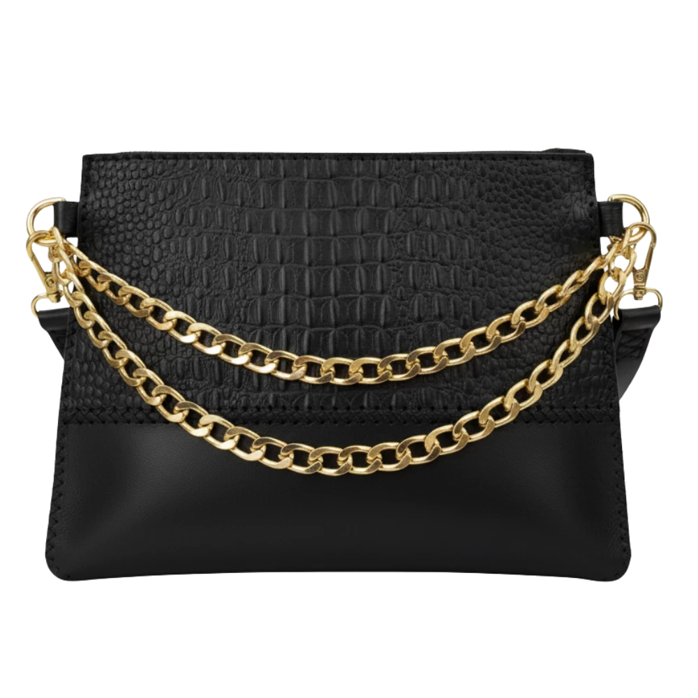 حقيبة كتف من الجلد الطبيعي مزودة بسلاسل زخرفية، بتصميم عملي بحجم 20×15 سم.