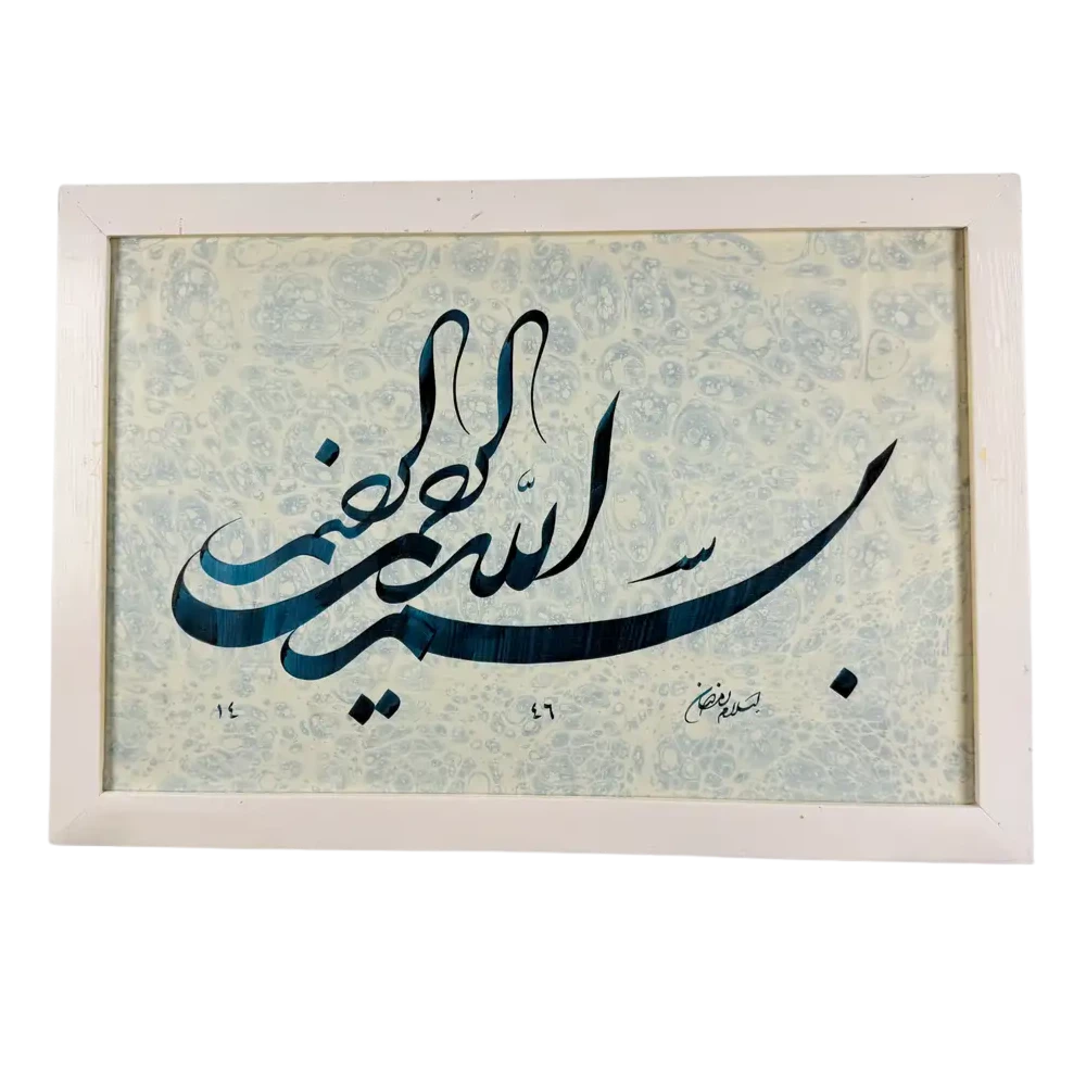 لوحة يدوية مكتوب عليها "بسم الله الرحمن الرحيم" بخط الشكسته باستخدام حبر طبيعي على ورق إبرو. تمثل البركة والاستعانة بالله في كل أمر. الخامات: حبر طبيعي، ورق إبرو. العمل: يدوي. يمكن عمل التصميم حسب الطلب.
