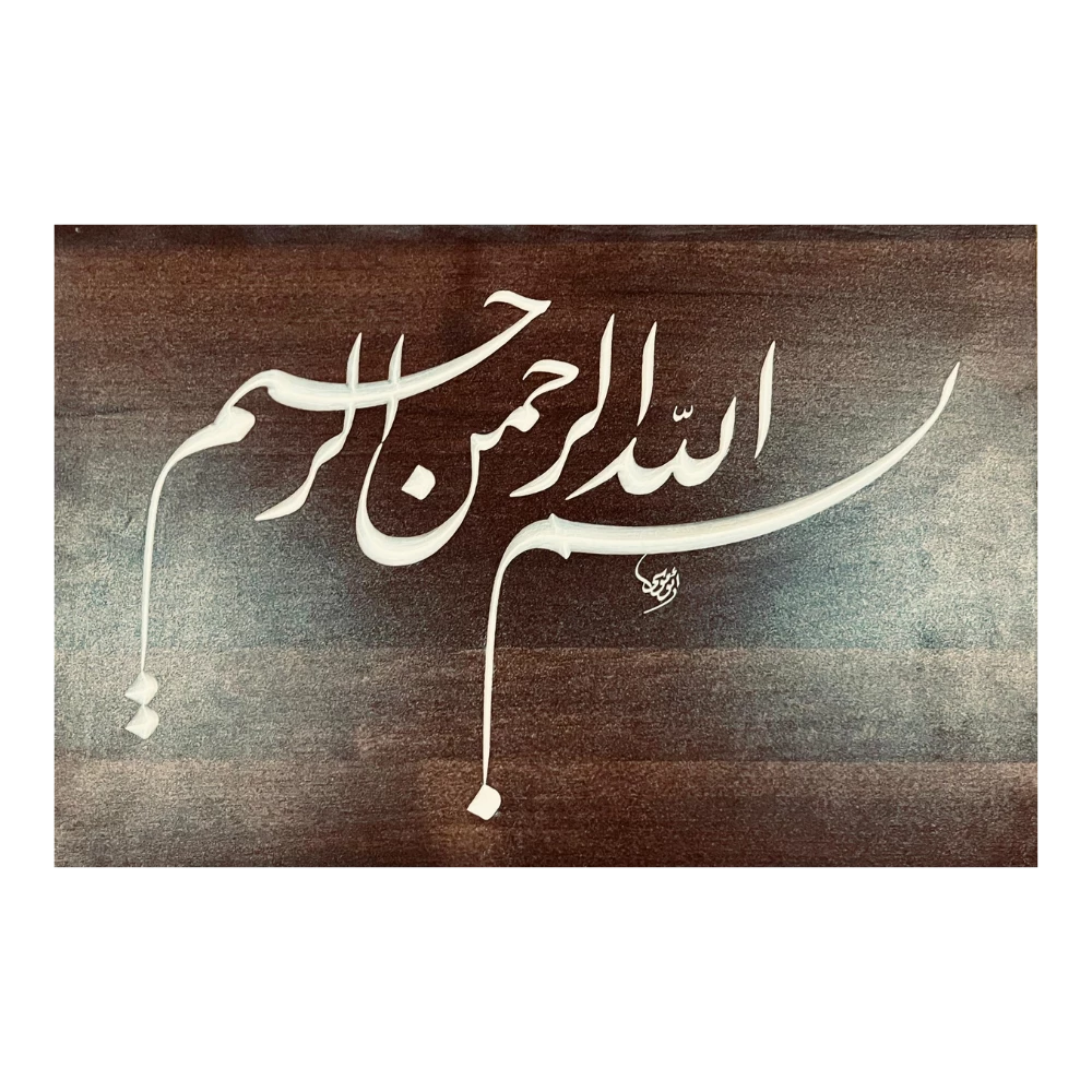 لوحة فنية أنيقة مكتوب عليها "بسم الله الرحمن الرحيم" بخط فارسي مميز على خشب مصنع. تجمع بين الجمال الفني والروحانية في تكوين راقٍ يعبر عن الطمأنينة والسكينة. الخامة: خشب مصنع. يمكن عمل التصميم حسب الطلب.