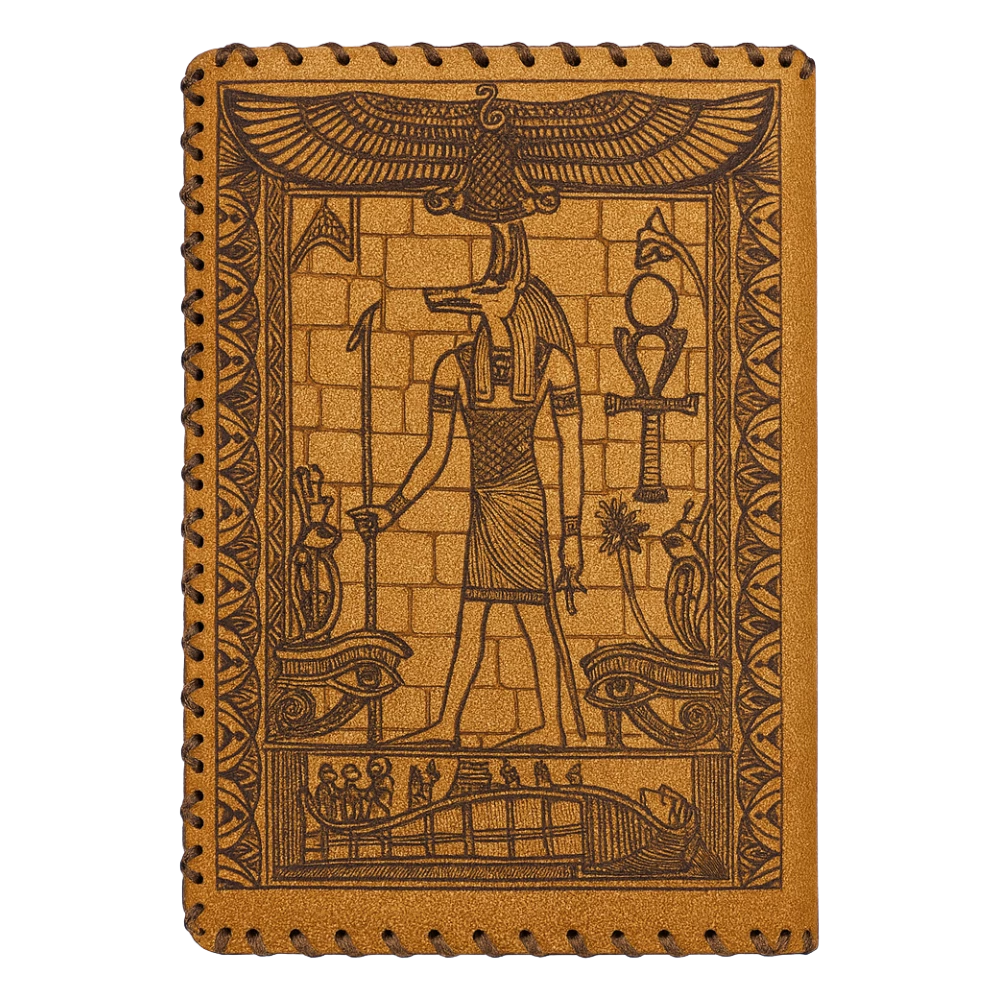 باست جاليري محفظة جلد يدوي نسائية بنقش أنوبيس تُعد قطعة فنية تجمع بين الأسطورة والجمال الخالد. مصنوعة يدويًا من جلد طبيعي فاخر بلون رملي دافئ، ومزخرفة بنقش دقيق للإله أنوبيس، إله الحماية والعالم الآخر في الحضارة المصرية القديمة، تحيط به رموز مقدسة مثل عنخ وعين حورس. يبرز النقش الغامق والتطريز اليدوي على الحواف دقة الحرفة وروعة التفاصيل. هذه المحفظة ليست مجرد إكسسوار، بل تحفة تعبّر عن التراث والروحانية والجمال الدائم، مخصصة للمرأة التي تقدّر الأصالة والرقي.