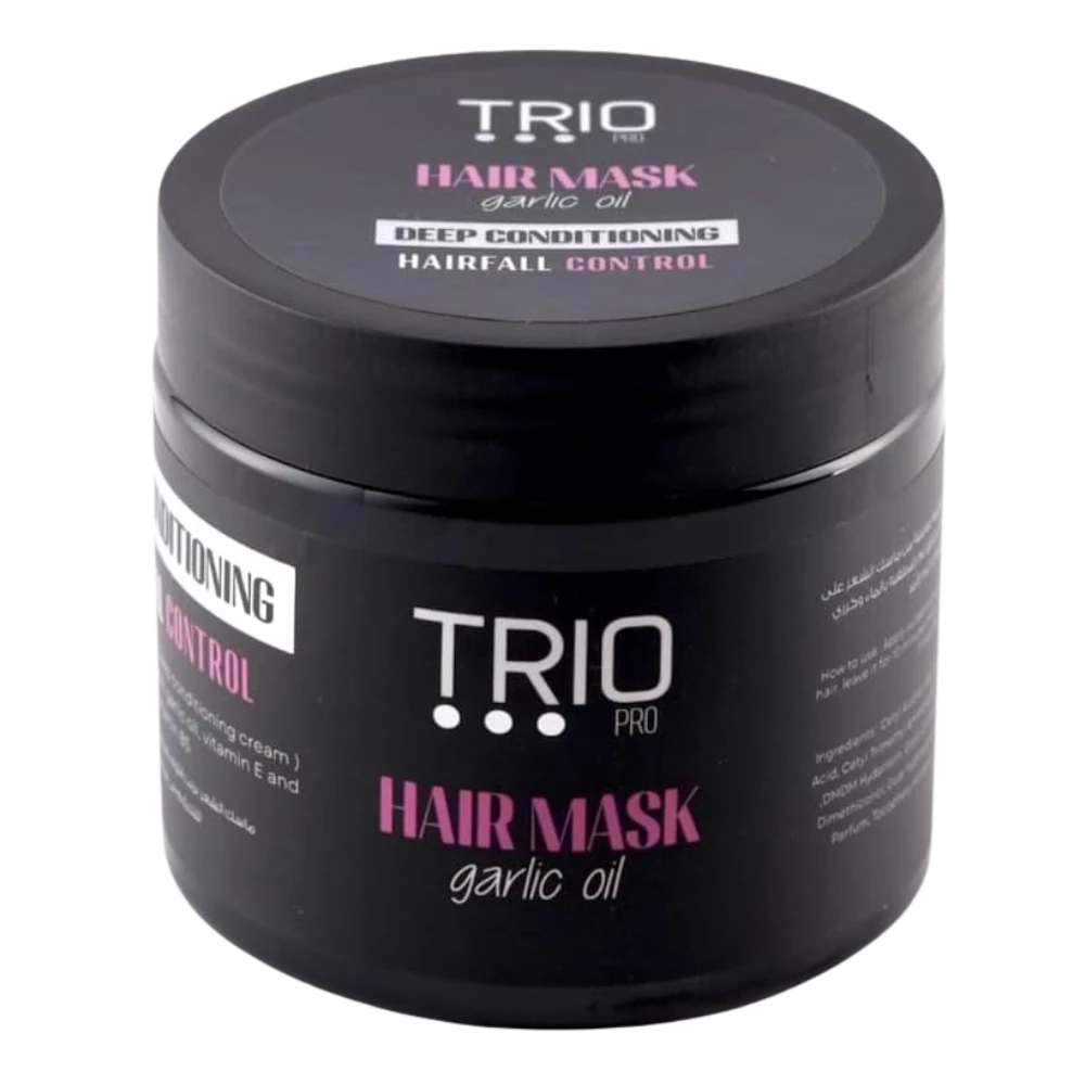 صمم خصيصاً لحماية شعرك من التساقط، غني بزيت الثوم وفيتامين E وبروفايتامين B5 للتحكم في تساقط شعرك. يمكنك استخدام ماسك تريو برو بأمان حيث إنه خالٍ من المواد الضارة (السيليكون – السلفات – البارابين).