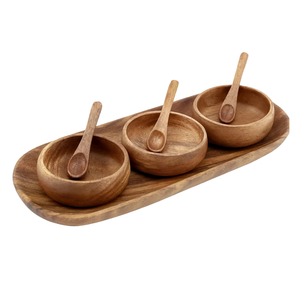 طقم تقديم خشبي فاخر مصنوع يدويًا يضم ثلاث أوعية مستديرة مع ملاعق متناسقة مرتبة على صينية خشبية أنيقة. مصنوع من خشب طبيعي عالي الجودة يجمع بين الطابع الريفي والأناقة العملية. مثالي لتقديم الصوصات أو التوابل أو المكسرات، ويضفي لمسة من الدفء والفخامة على أي مائدة. يتميز بملمس ناعم ونقوش خشبية طبيعية تجسد إتقان “حجازة” في الحرفية والأصالة.