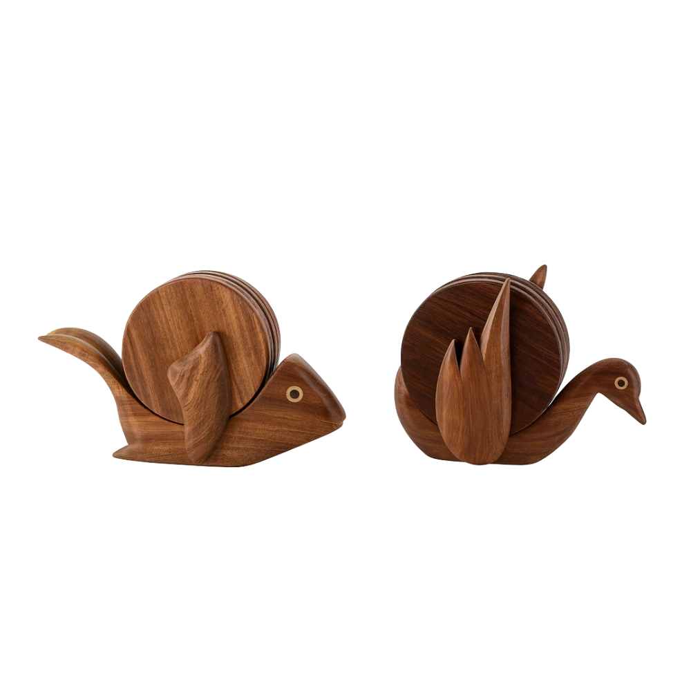 طقم مميز من قواعد الأكواب الخشبية المصنوعة يدويًا بتصاميم مستوحاة من الحيوانات، يضفي لمسة من الدفء والجمال الطبيعي على أي مساحة. كل قطعة منحوتة بعناية من الخشب الطبيعي الصلب ومصقولة بلمسة ناعمة تبرز نقوش الخشب الفريدة وجماله الأصيل. يتم حفظ القواعد داخل حامل منحوت بشكل فني يجمع بين العملية والفن في آنٍ واحد. مثالي للمنازل أو المقاهي أو كهدية راقية تعبّر عن ذوق رفيع وحرفية “حجازة” الأصيلة.