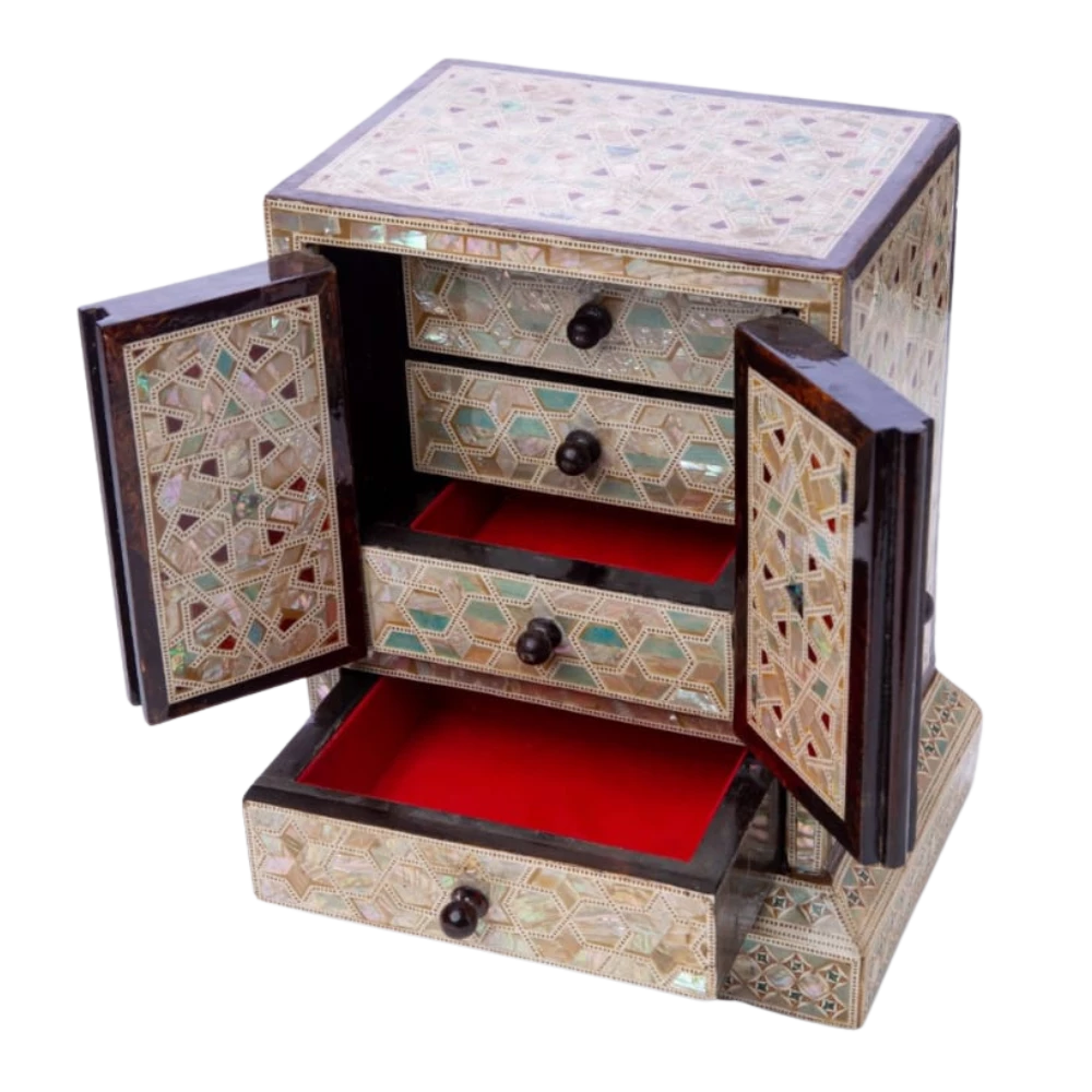 خزانة مجوهرات خشبية مطعمة بالصدف وبها أدراج