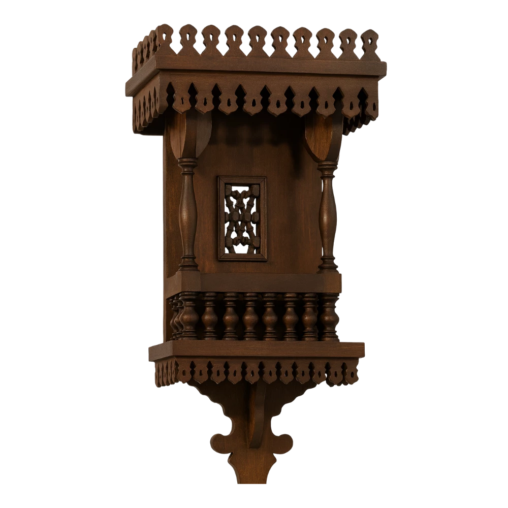 رف جداري خشبي فاخر مشغول يدويًا بتصميم مستوحى من فن المشربية التقليدي، يتميز بزخارف دقيقة وأعمدة خشبية منقوشة تضفي لمسة من الفخامة التراثية. لونه البني الغامق يعكس دفء الخشب الطبيعي، مما يجعله مثاليًا لعرض الفوانيس أو التحف أو القطع الزخرفية الصغيرة. قطعة فنية تضيف طابعًا تراثيًا وأناقة عربية أصيلة لأي مكان توضع فيه.