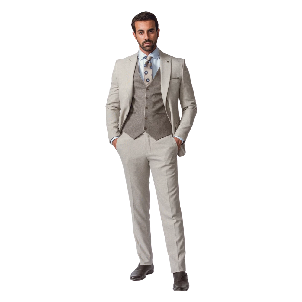 بدلة ثلاثية القطع سادة منسوجة من روبان باللون البيج، مصممة بقصة ضيقة أنيقة. متوفرة بالمقاسات 48 - 50 - 52 - 54 - 56 - 58.