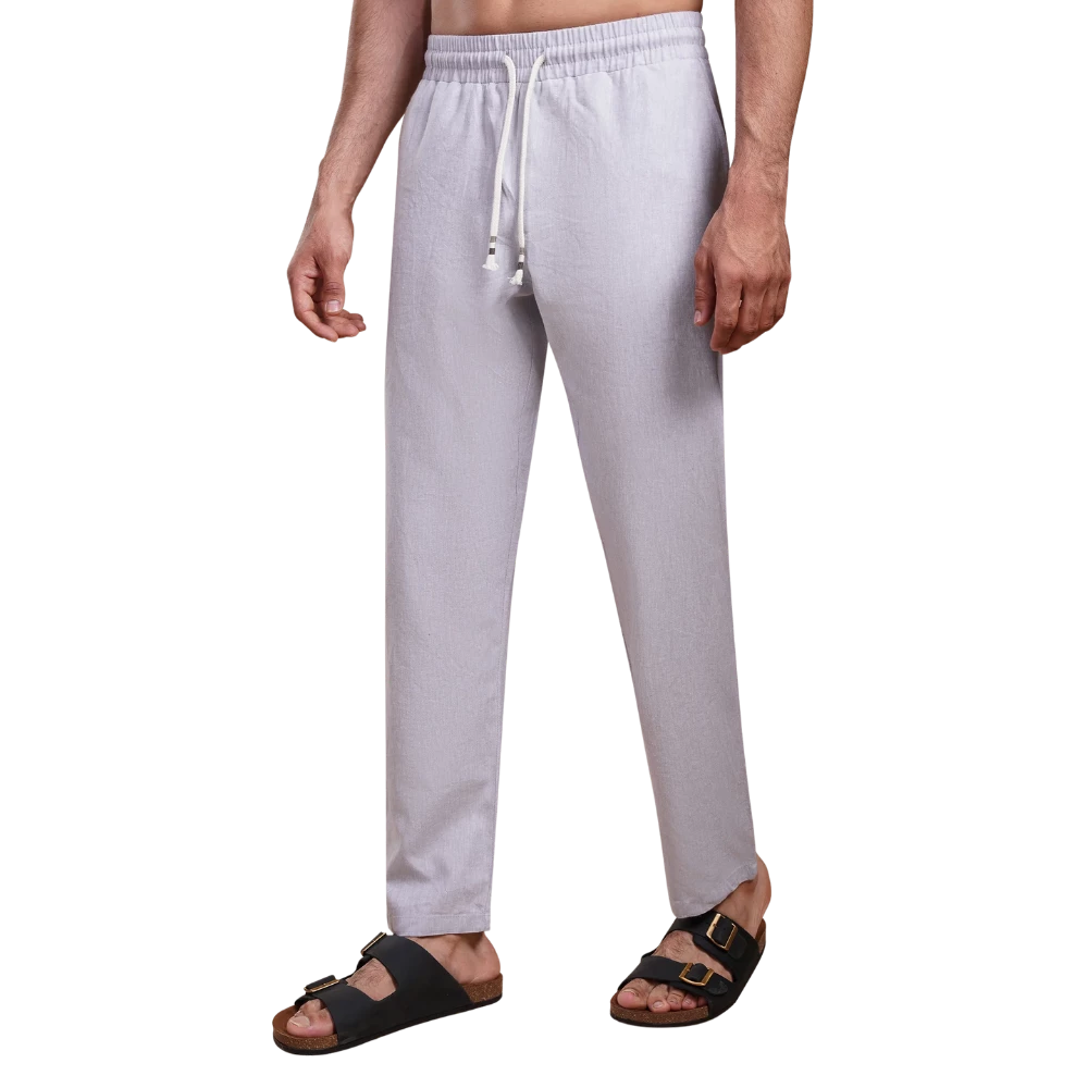 بنطال كتان قطني مغسول من روبان بخامة مريحة ومتينة تجمع بين العملية والتهوية المثالية. متوفر بالمقاسات M - L - XL - XXL - 3XL وبألوان الرمادي الفاتح - البيج.