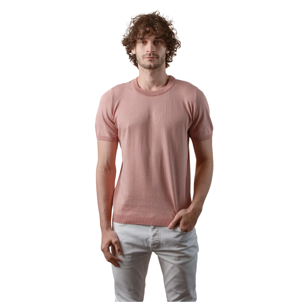 تي شيرت قطني محاك ميلانج بياقة مستديرة من روبان لإطلالة كاجوال مريحة تدوم طويلاً. متوفر بالمقاسات M - L - XL - XXL - 3XL وباللون المرجاني.