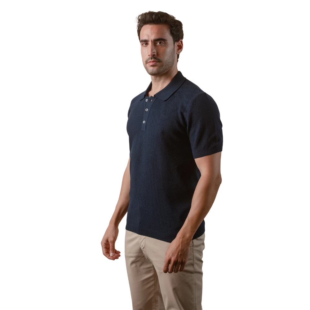 قميص بولو قطني محبوك مثقب من روبان باللون الكحلي مصنوع من قماش مريح ومتنفس. متوفر بالمقاسات M - L - XL - XXL - 3XL. مثالي للتوزيع بالتجزئة والجملة.