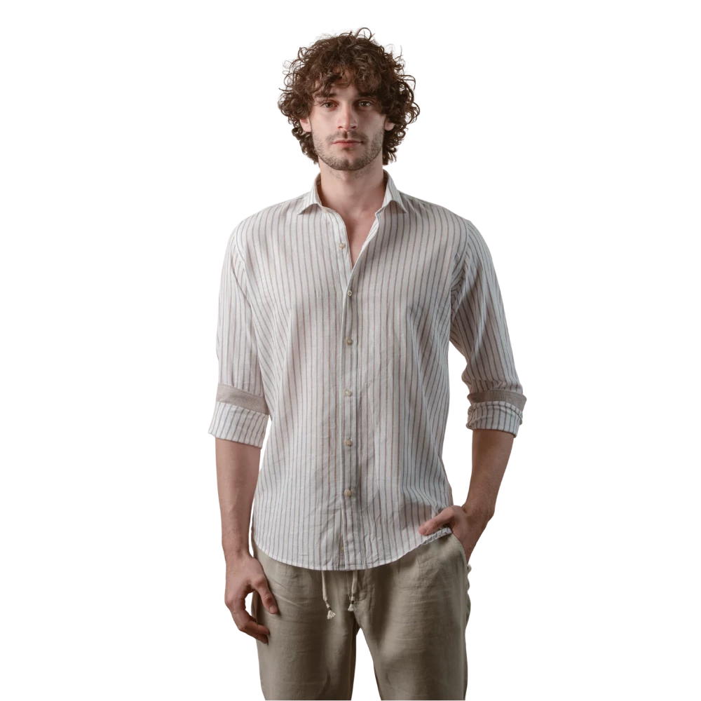 روبان قميص كتان قطني مخطط مغسول بقصة عادية - كافيه - متعدد المقاسات