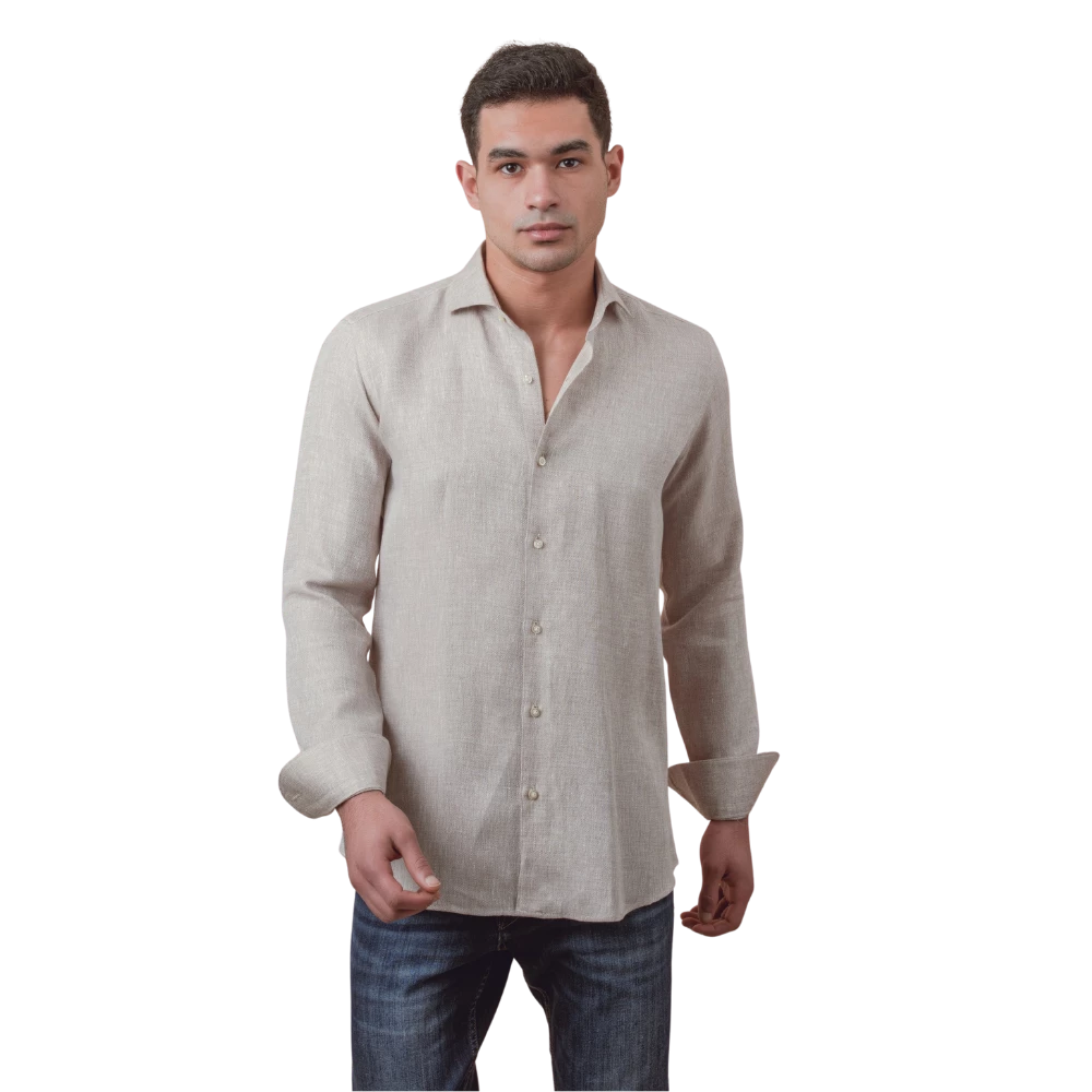 قميص كتان مغسول منسوج سادة من روبان بلون بيج أنيق يناسب الاستخدام اليومي. متوفر بالمقاسات M - L - XL - XXL - 3XL.