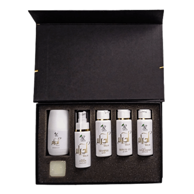 طقم فاخر خالٍ من العطور يشمل مزيل عرق، لوشن، شامبو، بلسم، جل استحمام، وصابون – متوافق مع متطلبات الحج والعمرة.
