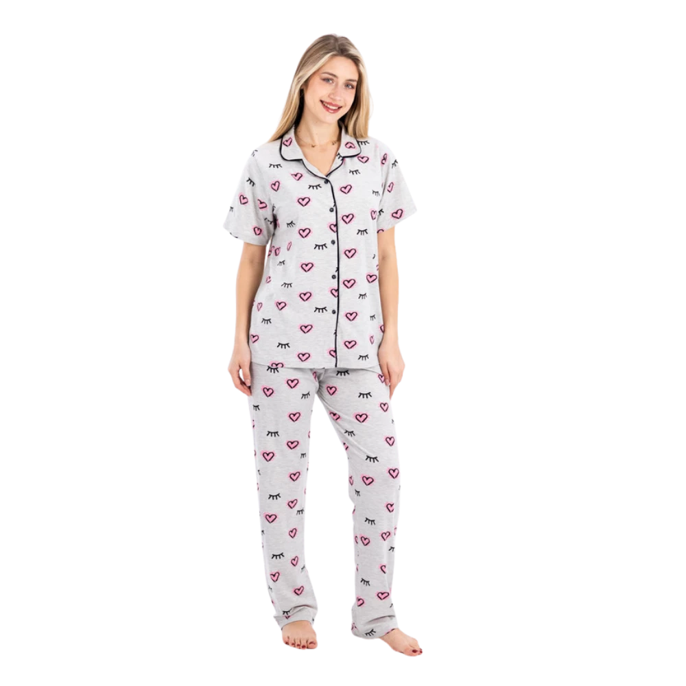 نوع المنتج: طقم بيجامة. الخامة: 95% قطن، 5% ليكرا. ناعم وقابل للتنفس ويتمتع بمرونة خفيفة لراحة قصوى أثناء النوم أو الاسترخاء. التصميم: طقم بيجامة باللون البيج مزين بطبعات قلوب وردية ورموش سوداء لطيفة. الجزء العلوي: قميص بأزرار قصير الأكمام مع ياقة وتحديد أسود (بايبينج). الجزء السفلي: بنطال طويل بخصر مرن قابل للتكيّف. المقاسات المتاحة: S، M، L، XL، 2XL، 3XL. اللون: بيج (كما هو موضح). التغليف: يُعبأ كل طقم في أكياس بلاستيكية محكمة لضمان النظافة والحماية أثناء النقل. تعليمات العناية: يُغسل آليًا على حرارة منخفضة، يُمنع استخدام المبيض، يجفف على درجة منخفضة أو يُهوّى للنتائج الأفضل. الحد الأدنى للطلب (MOQ): 48 قطعة لكل عرض منتج (مع إمكانية خلط المقاسات والألوان).