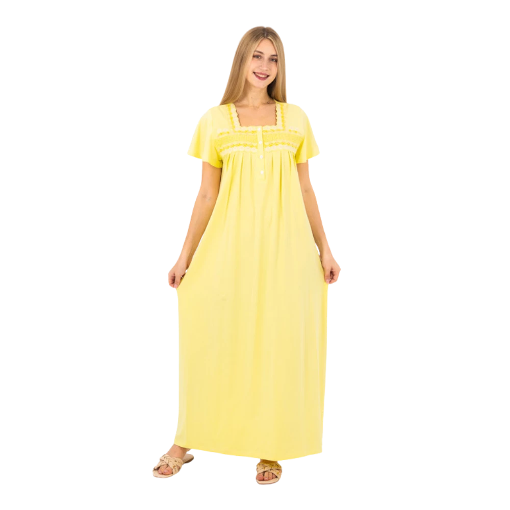 نوع المنتج: قميص نوم. الخامة: 95% قطن، 5% ليكرا. قماش خفيف وقابل للتنفس ويتمدد لراحة طوال الليل. التصميم: قميص نوم طويل أنيق بقصّة واسعة لمزيد من الارتياح. يتميز بأكمام قصيرة وياقة مربعة مع تفاصيل تطريز وأزرار أمامية لإطلالة جذابة. المقاسات المتاحة: M، L، XL، 2XL، 3XL، 4XL، 5XL. الألوان المتاحة: أصفر، بنفسجي، تركواز. الحد الأدنى للطلب: 48 قطعة لكل عرض (مع إمكانية خلط المقاسات والألوان). التغليف: تُعبأ كل قطعة في كيس بلاستيكي محكم للحفاظ على النظافة والجودة أثناء الشحن. تعليمات العناية: يُغسل بماء بارد، يُمنع استخدام المبيض، يُجفف على حرارة منخفضة أو يُهوّى.