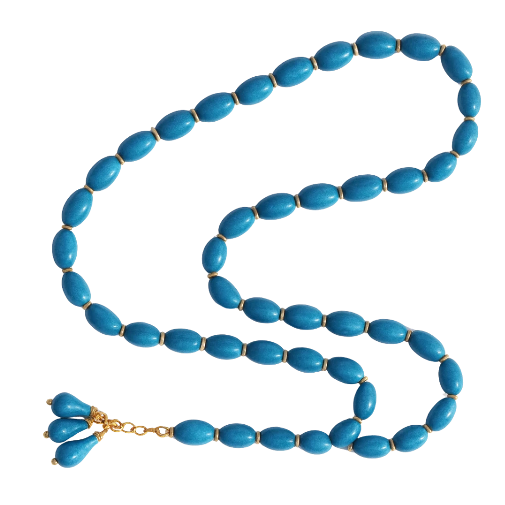 سبحة سيراميك يدوية الصنع مكونة من 33 حبة مستديرة بلون تركوازي مميز. بطول 50 سم تصلح للتسبيح وفي نفس الوقت كقطعة زخرفية روحية.