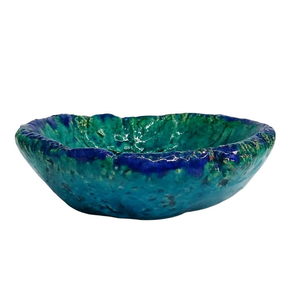 سلطانية ديكورية أنيقة مصنوعة يدوياً من السيراميك بتصميم ريفي دائري، مطلية بلمسة تركوازية لامعة مع تفاصيل بارزة، مثالية لتزيين الطاولات أو كقطعة ديكور مميزة. الأبعاد: 15×15 سم.