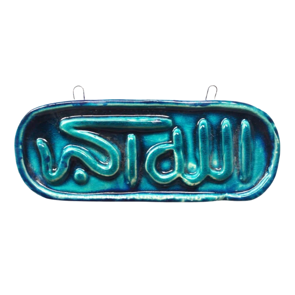 معلقة حائط سيراميك فيروزي بتصميم بيضاوي منقوش بعبارة الله أكبر، بتفاصيل فنية مميزة تضيف تنوعاً وجاذبية لديكور المنزل مع الحفاظ على اللمسة الروحانية. الأبعاد: 15×7 سم.