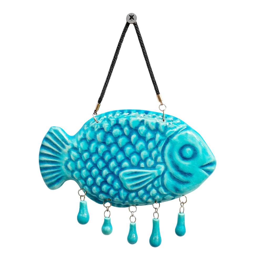 معلقة حائط راقية من السيراميك الفيروزي بشكل سمكة مزينة بقطع متدلية تضيف لمسة فنية جذابة. السمكة رمز قديم للخير والوفرة، مما يجعلها قطعة ديكور أنيقة تحمل معنى عميق في نفس الوقت. الأبعاد: 20×10 سم.