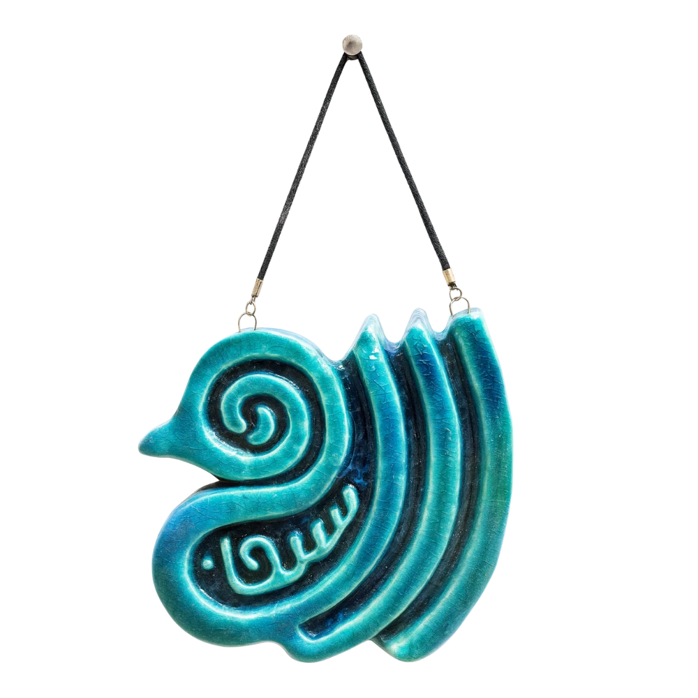 معلقة سيراميك فيروزي مصممة بشكل طائر أنيق، منقوشة بعبارة "سبحان الله" بخط عربي جذاب. قطعة زخرفية راقية تحمل رمزية السلام والروحانية، لتكون إضافة مميزة لديكور منزلك. الأبعاد: 15×15 سم.