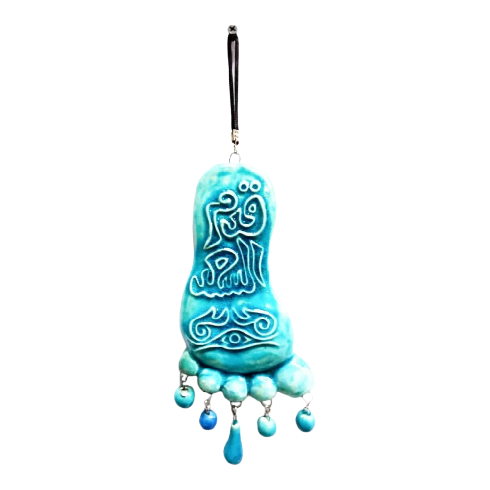 معلقة حائط سيراميك فيروزي مميزة على شكل قدم منقوشة بعبارة "قدم السعد"، مع حبات سيراميك معلقة تضيف لمسة زخرفية ساحرة. قطعة يدوية تحمل الطابع التراثي والبركة لتزيين منزلك بروح مميزة. الأبعاد: 17×8 سم.
