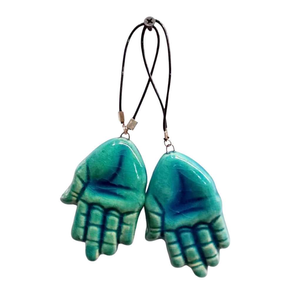 معلقة حائط سيراميك يدوية الصنع على شكل كف مفتوح. يرمز للحماية والطاقة الإيجابية، بلمسة تركوازية تضيف جمالاً وروحانية لأي مكان.