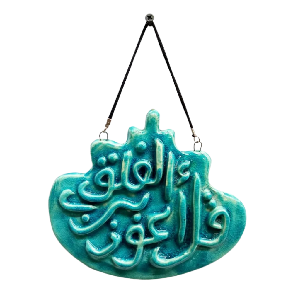 معلقة حائط مميزة من السيراميك الفيروزي منقوش عليها "قُلْ أَعُوذُ بِرَبِّ الْفَلَقِ" من سورة الفلق، لتجمع بين الجمال الفني والروح القرآنية، وتضفي على منزلك لمسة من الأناقة والحماية. الأبعاد: 17×11 سم.