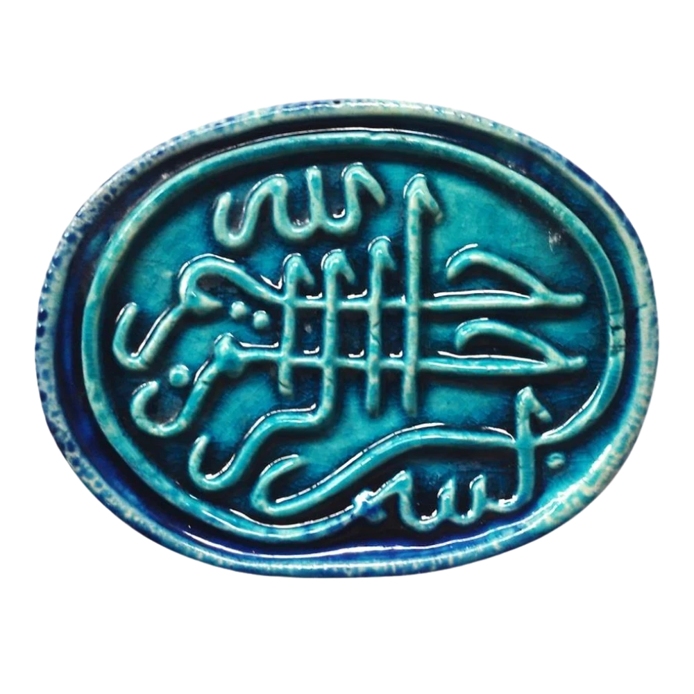 معلقة حائط سيراميك فيروزي أنيقة منقوشة بكتابة عربية جميلة لعبارة بسم الله. قطعة فنية إسلامية راقية تجمع بين الجمال والروحانية، مثالية لتزيين أي مكان في المنزل. الأبعاد: 20×10 سم.