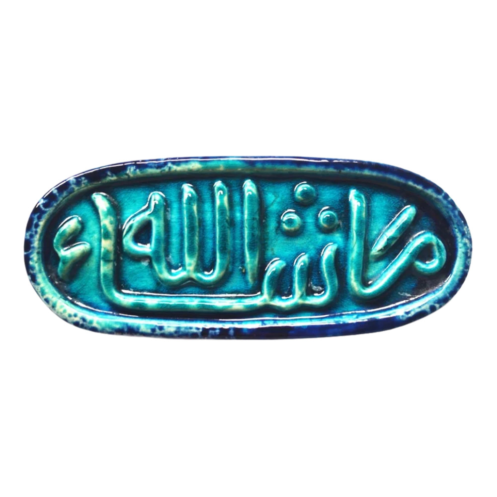 معلقة حائط سيراميك فيروزي منقوشة بكتابة عربية لعبارة ما شاء الله، تضيف لمسة روحانية وجمال تقليدي للمنزل مع رمز للبركة والحماية. قطعة فنية مميزة تعكس أصالة الفن الإسلامي. الأبعاد: 20×10 سم.