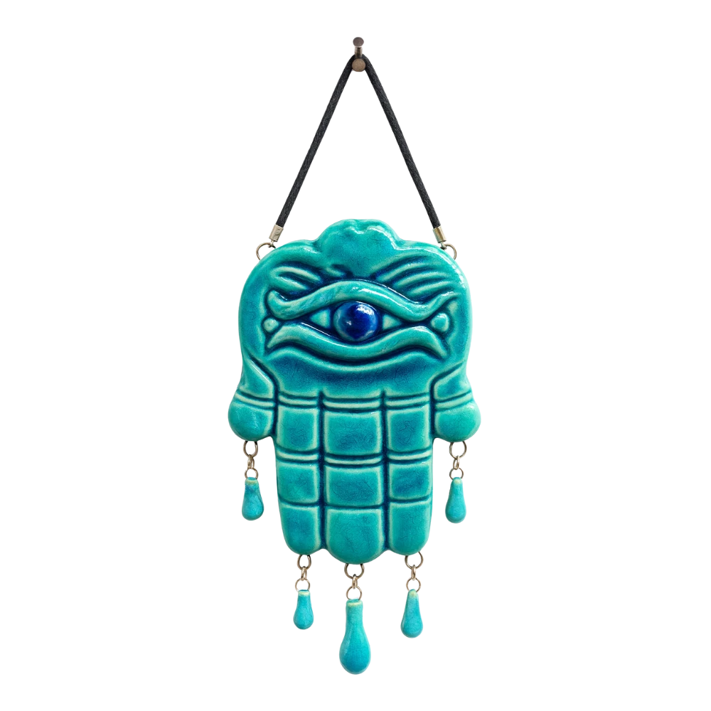 معلقة فاخرة من السيراميك الفيروزي بتصميم كف فاطمة (الخُمسة) مع عين زرقاء للحماية في المنتصف. ترمز للحماية والبركة والقوة، وتضفي على منزلك لمسة تراثية مميزة مع الزخارف المتدلية. الأبعاد: 20×10 سم.