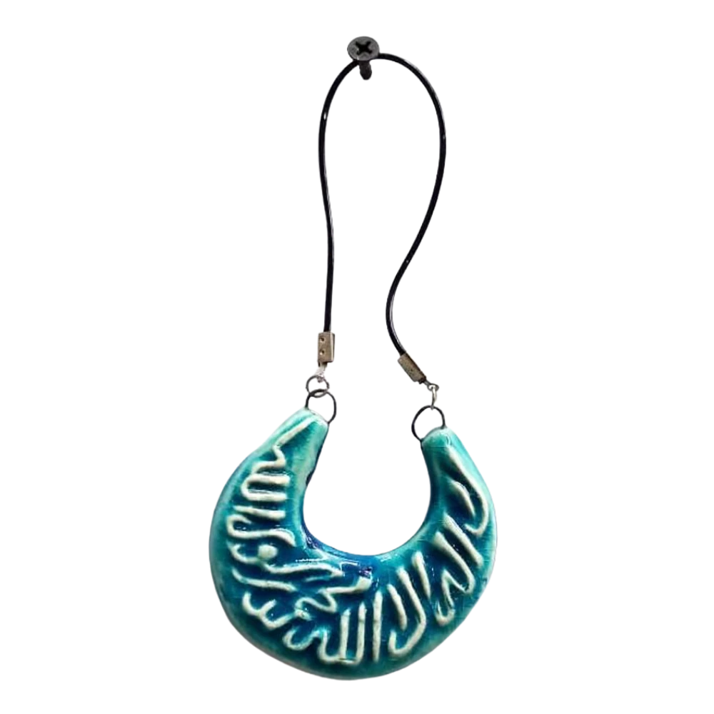 معلقة سيراميك باللون الفيروزي على شكل هلال منقوش عليه الشهادة "لا إله إلا الله محمد رسول الله". قطعة فنية وإيمانية فاخرة للديكور أو للإهداء. الأبعاد: 7×7 سم.