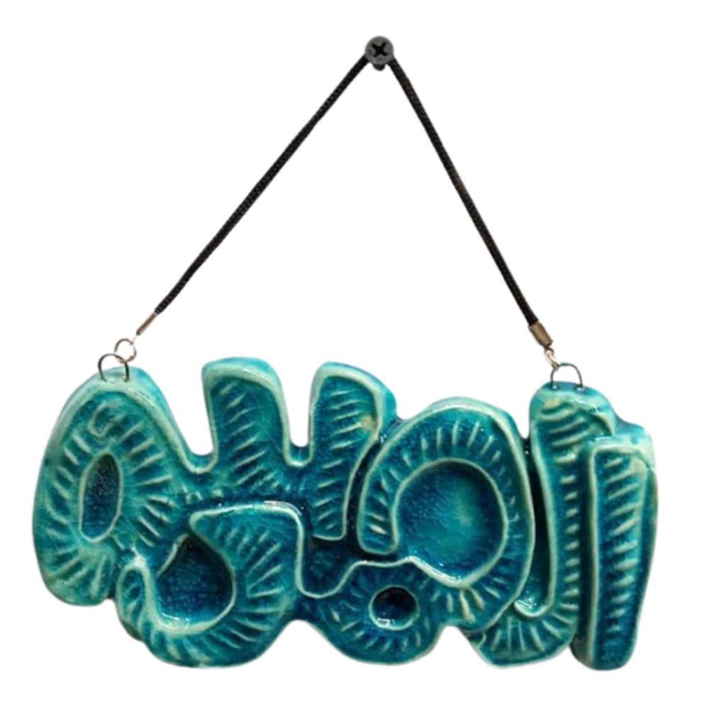 لوحة فنية من السيراميك مزخرفة بالخط العربي لعبارة "الحمد لله". تتميز بتزجيج فيروزي أنيق يجمع بين الروحانية والإبداع الفني لتزين أي مساحة في المنزل.