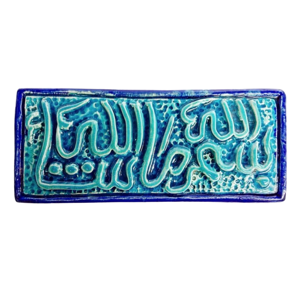 لوحة فنية مستطيلة من السيراميك منقوشة بعبارة "بسم الله ما شاء الله" بخط عربي أنيق. مصنوعة يدويًا بتزجيج فيروزي فاخر لتضفي لمسة روحانية وزخرفية على أي جدار. مثالية للديكورات التقليدية والعصرية.