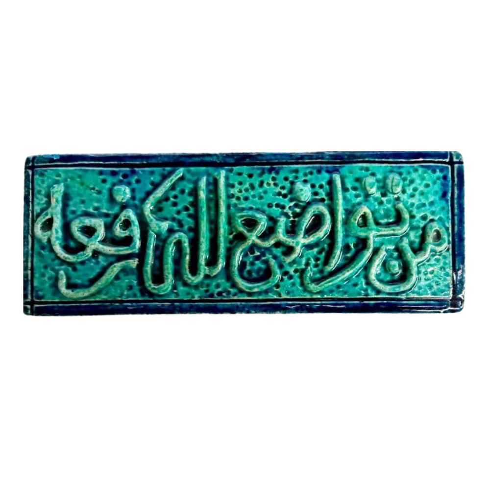 معلقة فنية سيراميكية يدوية مستطيلة الشكل منقوشة بالحكمة العربية “من تواضع لله رفعه”. تتميز بلون تركواز مع لمسات زرقاء داكنة، تضيف لمسة راقية ومعنى إيماني عميق لديكور منزلك.