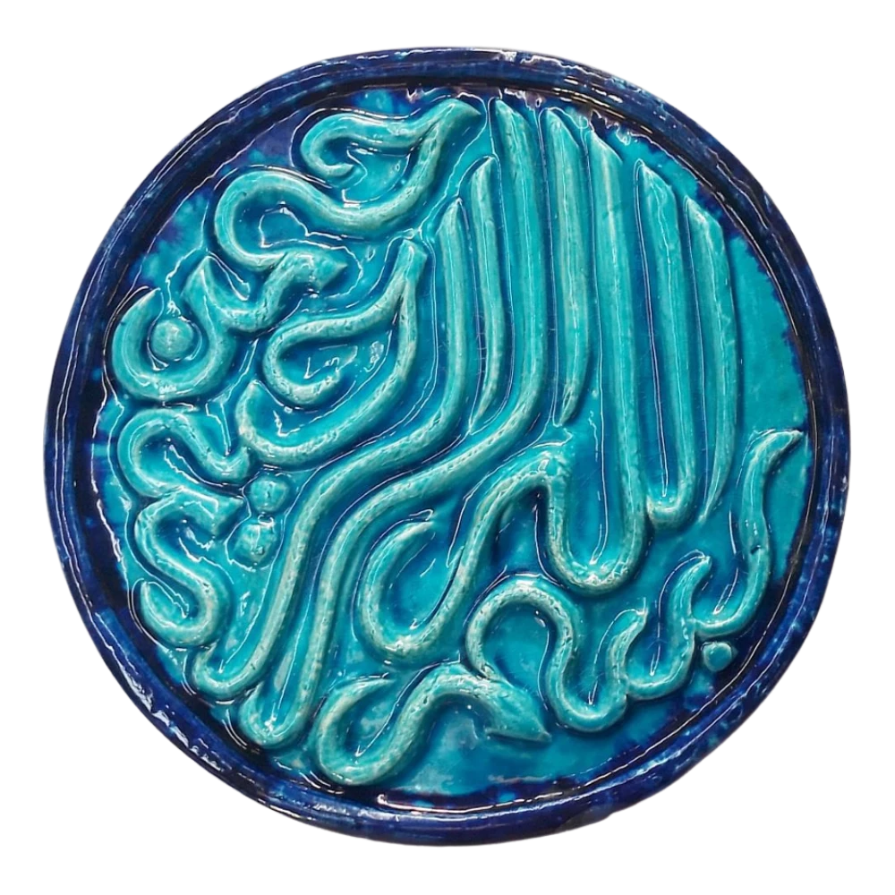 معلقة فنية سيراميكية راقية منقوشة بعبارة "بسم الله الرحمن الرحيم" بالخط العربي المزخرف مع تزجيج تركواز أنيق، تضفي لمسة روحانية وجمالية مميزة على ديكور المنازل أو المكاتب.
