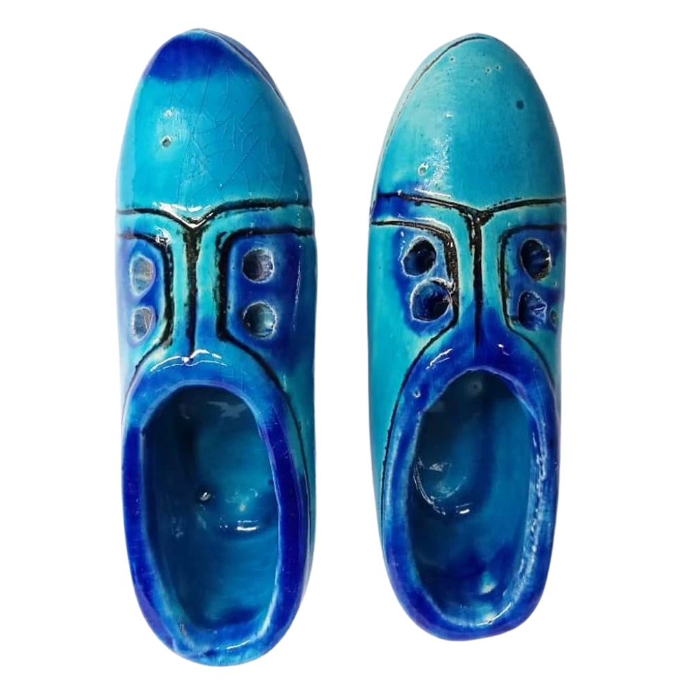 زوج من الأحذية الديكورية المصنوعة يدوياً من السيراميك بتصميم تركوازي تقليدي مع تفاصيل دقيقة. مثالية لإضافة لمسة تراثية مميزة للديكور. الأبعاد: 5×10 سم.