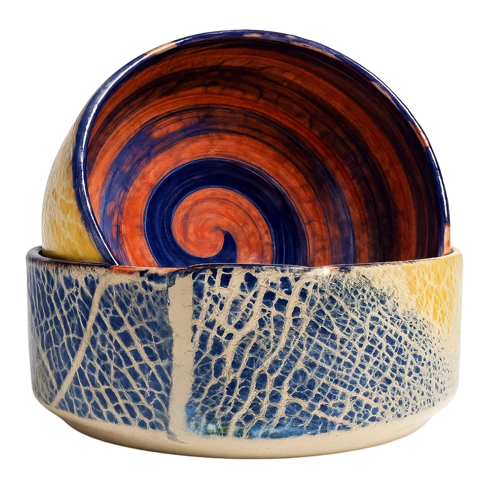 وعاء سيراميك يدوي الصنع بلمسة فنية مع تداخل ألوان الأزرق والطوبي من الداخل، وتأثير متشقق أنيق من الخارج. مثالي لتقديم السلطات أو الشوربة أو كقطعة ديكور مميزة. القطر: 17 سم، السعة: 0.75 لتر (25.5 أونصة).