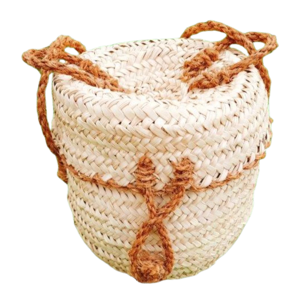 سلة أنيقة مصنوعة يدويًا من الخوص الطبيعي مزودة بغطاء محكم وحبال مزخرفة تضيف لمسة تراثية جميلة. مثالية لحفظ الأدوات الصغيرة أو مستحضرات التجميل، كما تضيف لمسة طبيعية وريفية جذابة لأي ركن في المنزل.
