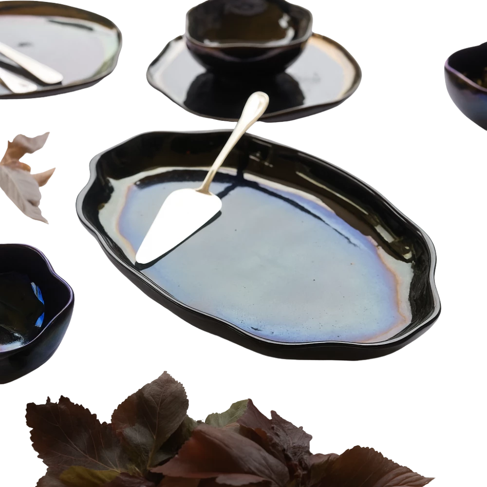 طقم تقديم خزفي فاخر مصنوع يدويًا بتشطيب أسود لامع يعكس درجات من الأزرق والبنفسجي. يتميز كل طبق بتصميمه المتدرج وحوافه المتموجة التي تجمع بين الأناقة والفن، مما يجعله مثاليًا لتقديم الحلويات والمقبلات أو كقطعة عرض راقية على الطاولة.