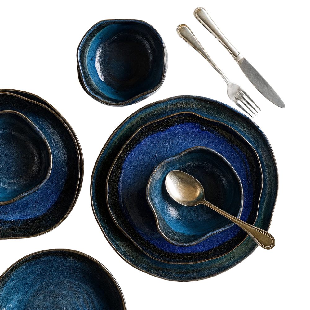 طقم عشاء خزفي فاخر مصنوع يدويًا بلون أزرق عميق يشبه لون المحيط. يتميز بحواف متموجة طبيعية وتشطيب لامع متعدد الطبقات يمنحه طابعًا فنيًا فريدًا. مثالي لتقديم الأطعمة أو كقطعة ديكور راقية تضيف لمسة فخمة إلى مائدة الطعام.