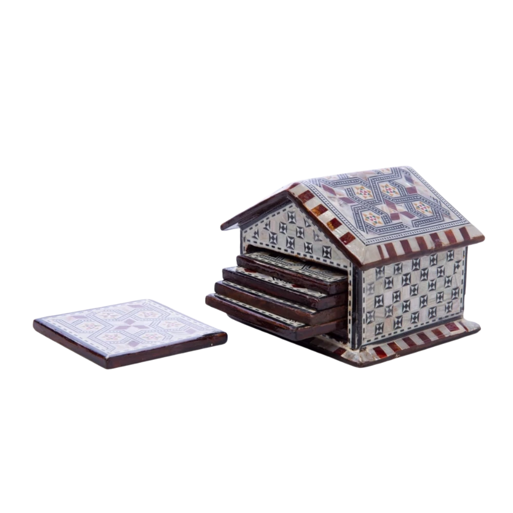 طقم قواعد أكواب خشبية مميز على شكل منزل تقليدي، مصنوع يدويًا ومطعم بقطع من الصدف الطبيعي وزخارف فسيفسائية أنيقة. يجمع بين العملية والجمال الفني المصري الأصيل. يرجى ملاحظة أن كل قطعة مصنوعة يدويًا، لذلك قد يختلف التصميم أو الألوان قليلًا عن الصورة.