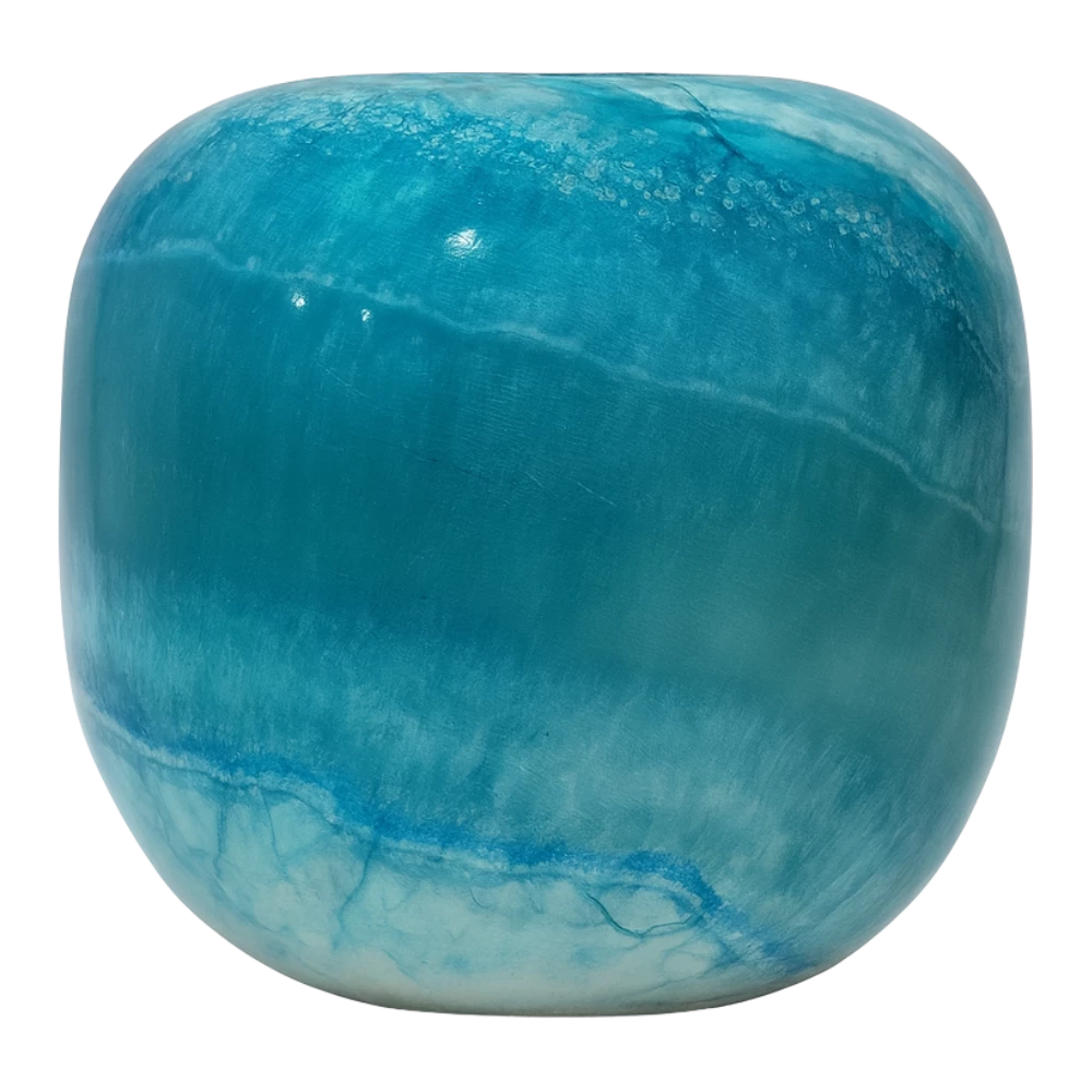 فازة كروية أنيقة مصنوعة يدويًا من حجر الألباستر الطبيعي باللون الفيروزي، بمقاس 15×15 سم. تتميز بانسيابية شكلها ولمعان لونها الساحر الذي يشبه لون البحر، مما يجعلها قطعة فنية فاخرة تضيف لمسة جمالية عصرية لأي ديكور. يرجى ملاحظة أن كل قطعة مصنوعة يدويًا، لذلك قد يختلف التصميم أو الألوان قليلًا عن الصورة.