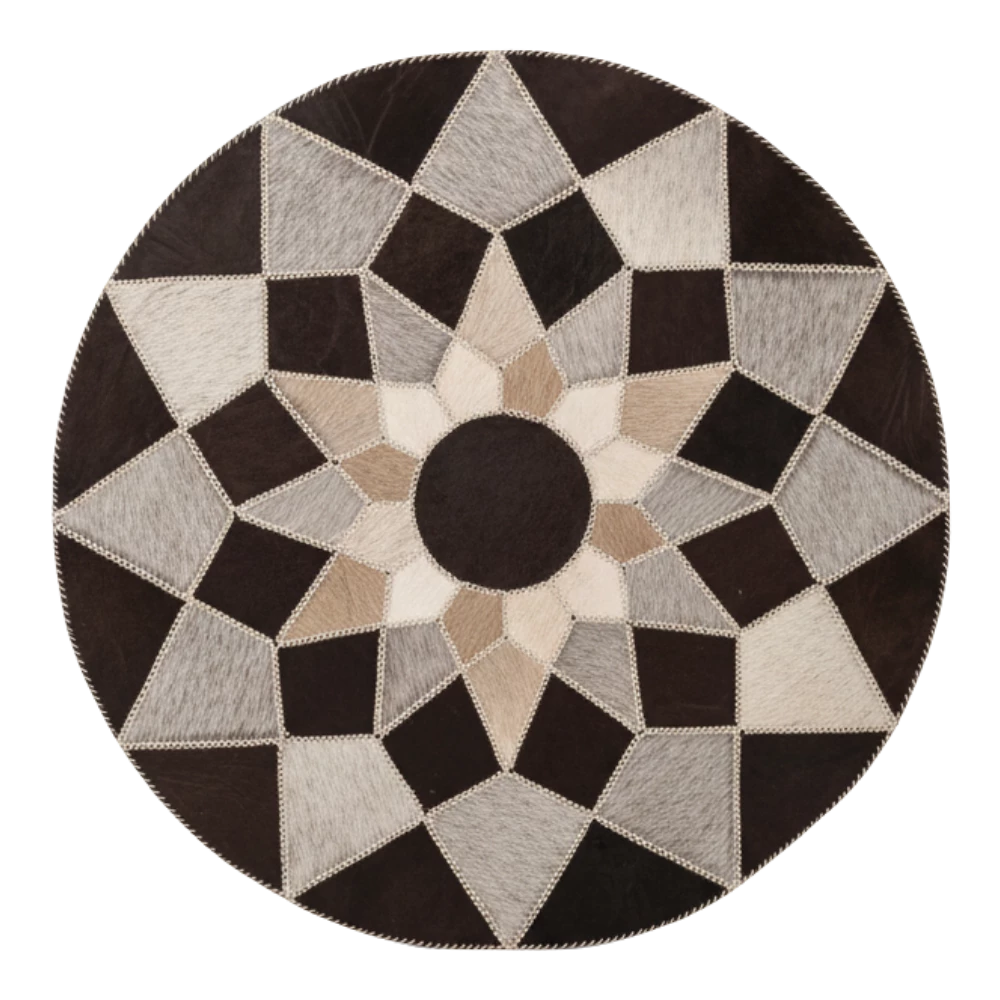 سجادة دائرية فريدة مصنوعة يدوياً من الجلد الطبيعي، تجمع بين الطابع الريفي والمتانة. مثالية لتكون مركزاً مميزاً في ديكور عصري أو تقليدي. متوفر بمقاسات مختلفة عند الطلب.