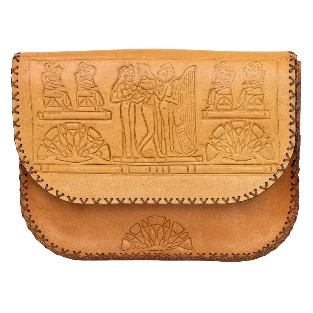 باست جاليري حقيبة جلد يدوي بلون الكراميل الفاتح منقوشة بنقوش فرعونية بارزة