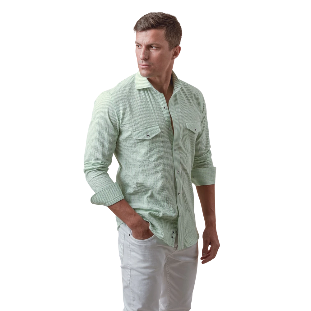 قميص قطني مخطط بنسيج مجعد من روبان بتصميم عصري مميز وقصة ضيقة أنيقة. متوفر بالمقاسات M - L - XL - XXL - 3XL وبألوان الأصفر - الأخضر - الأزرق - الأزرق السماوي - البرتقالي.