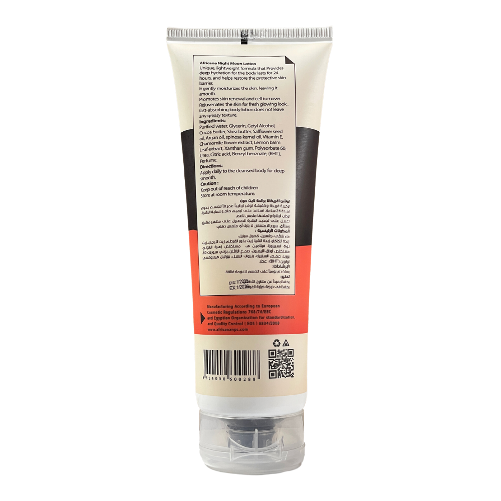يتميز لوشن أفريكانا "نايت مون" بتركيبته الغنية التي تمنح البشرة ترطيباً مكثفاً ونعومة تدوم طويلاً، مع عطر فاخر يضفي لمسة مميزة تدوم لساعات.