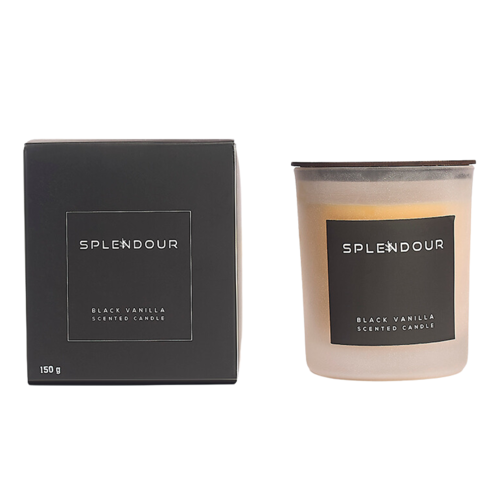 شمعة معطرة من Splendour بعبير الفانيليا السوداء الغني، تضفي إحساسًا بالدفء والراحة، مثالية للأجواء الهادئة والمميزة في المنزل أو المكتب.