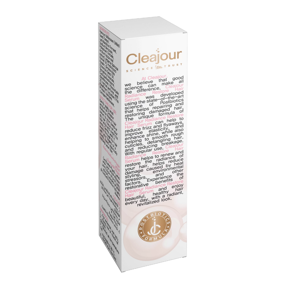 تم تطوير سيروم الشعر- Cleajour Radiance Restore Hair Serum – باستخدام أحدث تقنية في منتجات العناية بالشعر،تقنية Postbiotics التي تساعد على إصلاح الشعر التالف يمكن لهذه التركيبة الفريدة تقليل هيشان الشعر، وتحسين النسيج الخاص به، وتعزيز اللمعان، وفك تشابك الشعر، وتقليل حدوث أي تقصف.