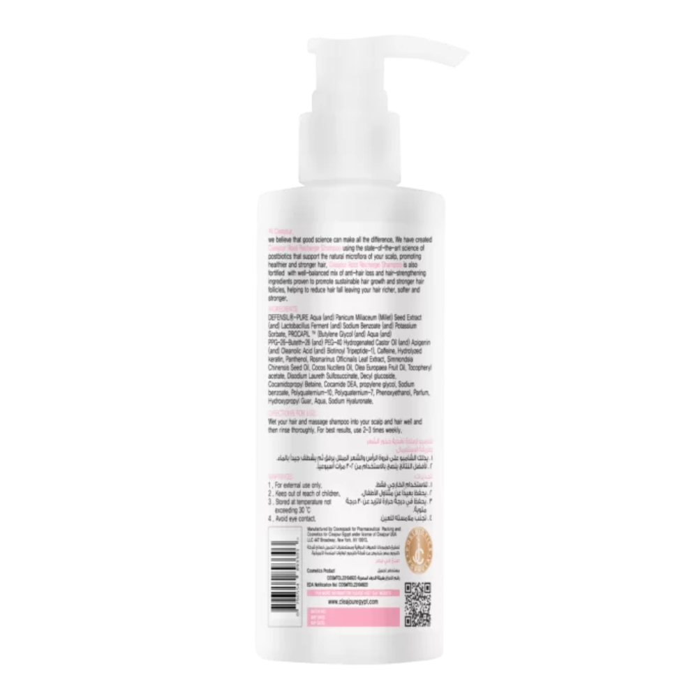 تم تطوير شامبو -Cleajour Root Recharge – باستخدام أحدث العلوم في مجال البوستبيوتيكس، والتي يمكن أن تحدث ثورة في مجال العناية بالشعر، وتعزز الشعر بصحة وقوة. يتميز شامبو – Cleajour Root Recharge -بتركيبته المتوازنة بشكل جيد من مكونات تقوية و تقليل تساقط الشعر المثبتة أنها تعزز نمو الشعر الصحي وتقوي بصيلات الشعر، مما يساعد على تقليل تساقط الشعر ويجعله أكثر سمكًا وأطول وأقوى.